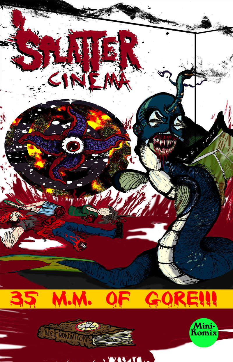 Splatter Cinema shows 35 MM of gore! Slasher and horror films are brought out of the darkness and on to the big screen! Take a tour of the afterlife, employ blue collar zombies, Santa Claus goes on a slay ride, love Lovecraft's "The Thing In The Moonlight", test out the Whore Liquifier, get Street Trashed, and see a day in the life of Ed Gein! Psychotronic scares from the days of grindhouse! 32 pages long.